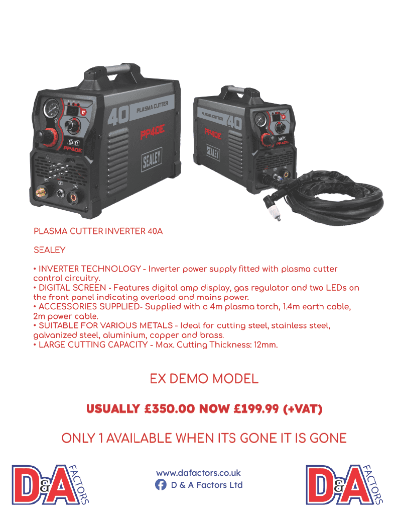 New at D&A Motor Factors: Sealey 40A Plasma Cutter (PP40E)Now available at D&A Factors Ltd — your trusted local supplier of professional-grade workshop equipment.Visit: www.dafactors.co.uk Upgrade your cutting capabilities with the Sealey PP40E Plasma Cutter Inverter, designed for precision, power, and reliability. Key Features Whether you’re working on fabrication, bodywork repairs, exhaust projects, or general […]